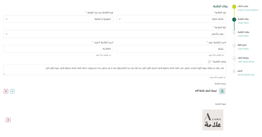 يمكنك الحصول على ترجمة معتمدة لعلامتك التجارية من مكتب ترجمة معتمد، ويقدم موقع علامة هذه الخدمة بالإضافة الى كتابة جميع المعلومات المطلوبة أعلاه من قبل مختص. يمكنك طلب ترجمة لعلامتك من خلال الضغط هنا.