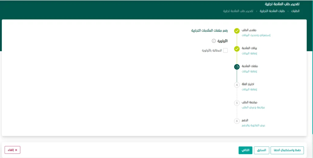 ستظهر هذه الصفحة، اذا كنت قد سجلت علامتك التجارية في بلد آخر غير السعودية من قبل، فيمكنك تحديد “المطالبة بالأولوية”. إذا كانت هذه أول مرة تقوم فيها بتسجيل علامتك التجارية، فاضغط على التالي بدون المطالبة بالأولوية.