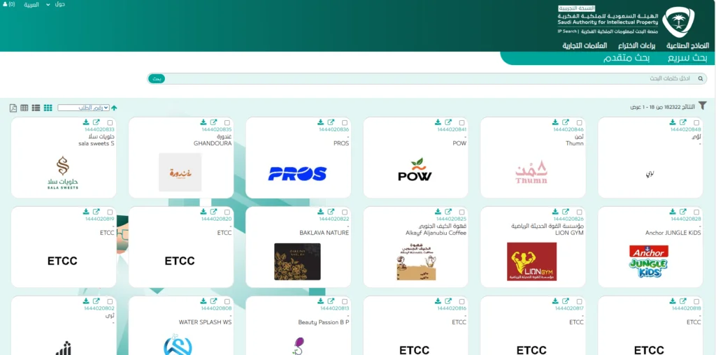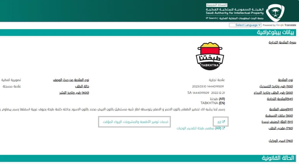 لنأخذ شعار الموقع كمثال، فلو كنت تريد تسجيل كلمة “علامة” كعلامة تجارية لك، يجب عليك البحث أولاً باللغة العربية. من الأفضل استخدام البحث المتقدم للحصول على نتائج بحث أكثر دقة. لنفترض ان فئة أو مجال العلامة التجارية الخاصة بالموقع هي المطاعم، حيث رقم هذه الفئة هي 43.