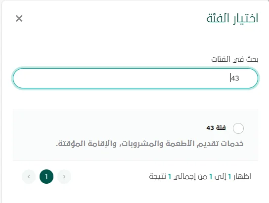 بعد البحث، يتبين لنا أن الفئة المشهورة لتسجيل المطاعم هي فئة رقم 43، خدمات توفير الأطعمة والمشروبات، الإيواء المؤقت. يمكننا الآن الرجوع الى موقع الهيئة الفكرية واختيار هذه الفئة لعلامتنا التجارية.