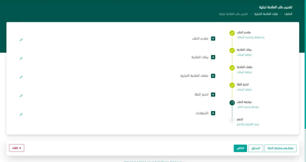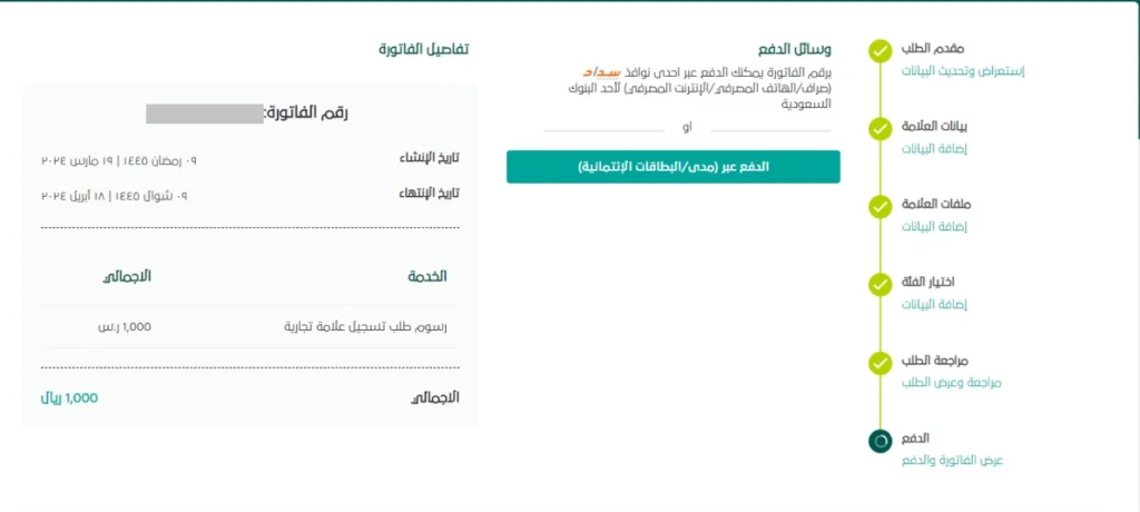 يجب عليك الآن تسديد رسوم رفع الطلب وهي 1000 ريال سعودي، بعد الدفع، سيتم إرسال طلبك الى الهيئة الفكرية وستتم مراجعته في غضون 15 الى 90 يوم.
