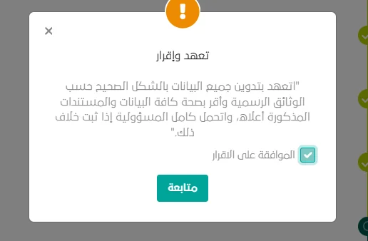 بعد تعبئة المعلومات، اضغط على حفظ البيانات، ستظهر لك نافذة تعهد بصحة المعلومات، اضغط على “تأكيد وإرسال” بعد التأكد من جميع المعلومات المُدخلة.