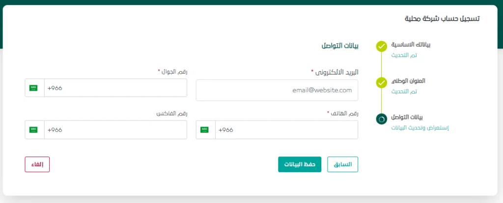 ستظهر لك الآن نافذة بيانات التواصل، قم بإدخال البريد الالكتروني ورقم الجوال ورقم الهاتف الخاص بشركتك، اذا لم يكن لديك رقم هاتف، فيمكنك ادخال نفس رقم الجوال.