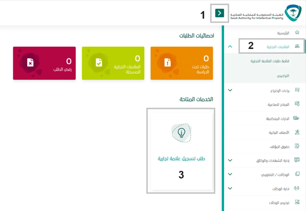 بعد تسجيل دخولك الى موقع الهيئة واختيار الحساب الذي تود تسجيل العلامة عليه، اتبع الخطوات أدناه لبدء رفع طلب تسجيل علامة تجارية